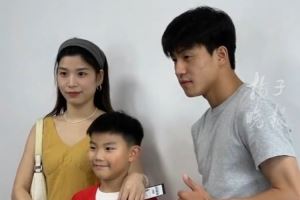 7月22日,这名小球迷在妈妈陪伴下,从盐城队队员花志成的手中接过签名的盐城队同款球衣和足球,露出了开心的笑容。